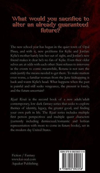 What would you sacrifice to alter an already guaranteed future? The new school year has begun in the quiet town of Opal Pines, and with it, new problems for Kylie and Jordan: Kylie's mother barely lets her out of sight, and Jordan's new friend makes it clear he's no fan of Kylie. Even their older selves are at odds with each other: Siani refuses to intervene in the events to come; meanwhile, Rotanu is not sure the ends justify the means needed to get there. To make matters even worse, a familiar woman from the June kidnapping is back and wants Kylie's head. What happens when the past is painful and still seeks vengeance, the present is lonely, and the future uncertain? Riyati Rivals is the second book of a new adult/adult contemporary, low dark fantasy series that seeks to explore themes of identity, legacy, the greater good, and finding your own path in life. The Riyati series includes multiple first person perspectives and multiple queer characters (currently including demisexual/romantic and lesbian representation with more to come in future books), set in the modern day United States.