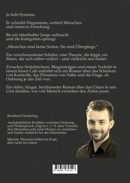 Es geht um die Suche nach Ordnung in einer Welt voller innerer und äußerer Widersprüche. Im Zentrum steht die Frage, ob Menschen wirklich sortierbar sind - oder ob genau das Menschliche im Chaos liegt. Zwischen Sozialtheorie, persönlicher Nähe und emotionalem Rückzug entsteht ein Roman über das Scheitern von Kontrolle und den Versuch, sich trotzdem zu orientieren.Ein Mann beobachtet Menschen und entwickelt ein Modell, um Nähe, Kontrolle und Widerstand messbar zu machen. Doch als ein Junge auftaucht, der sich dem Raster entzieht, beginnt die Theorie zu kippen - und mit ihr der Protagonist selbst. Was folgt, ist ein leiser Zusammenbruch, ein Rückzug aus Systemen, und eine poetische Rückkehr zur Welt. Das Buch erzählt von Beziehungen, Verlust, Erkenntnis - und vom langsamen Verlernen des Messbaren.