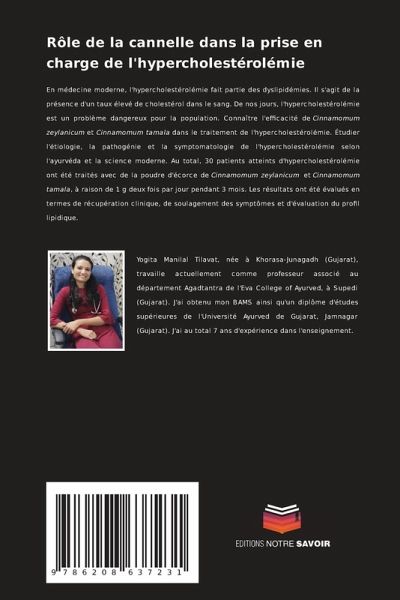 En médecine moderne, l'hypercholestérolémie fait partie des dyslipidémies. Il s'agit de la présence d'un taux élevé de cholestérol dans le sang. De nos jours, l'hypercholestérolémie est un problème dangereux pour la population. Connaître l'efficacité de Cinnamomum zeylanicum et Cinnamomum tamala dans le traitement de l'hypercholestérolémie. Étudier l'étiologie, la pathogénie et la symptomatologie de l'hypercholestérolémie selon l'ayurvéda et la science moderne. Au total, 30 patients atteints d'hypercholestérolémie ont été traités avec de la poudre d'écorce de Cinnamomum zeylanicum et Cinnamomum tamala, à raison de 1 g deux fois par jour pendant 3 mois. Les résultats ont été évalués en termes de récupération clinique, de soulagement des symptômes et d'évaluation du profil lipidique.