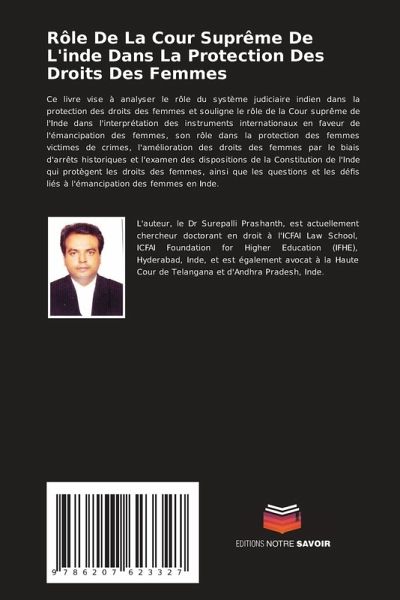 Ce livre vise à analyser le rôle du système judiciaire indien dans la protection des droits des femmes et souligne le rôle de la Cour suprême de l'Inde dans l'interprétation des instruments internationaux en faveur de l'émancipation des femmes, son rôle dans la protection des femmes victimes de crimes, l'amélioration des droits des femmes par le biais d'arrêts historiques et l'examen des dispositions de la Constitution de l'Inde qui protègent les droits des femmes, ainsi que les questions et les défis liés à l'émancipation des femmes en Inde.