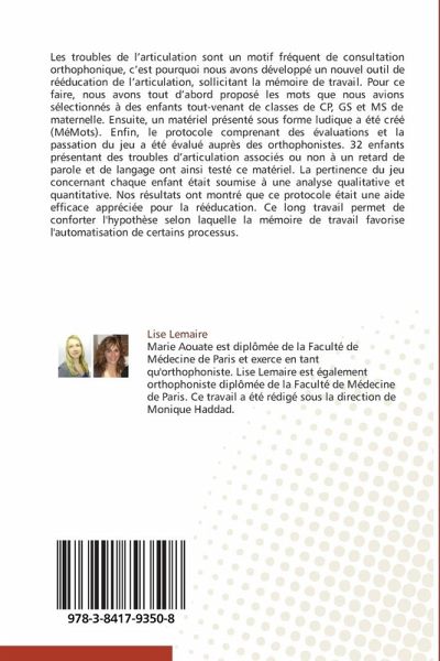 Les troubles de l articulation sont un motif fréquent de consultation orthophonique, c est pourquoi nous avons développé un nouvel outil de rééducation de l articulation, sollicitant la mémoire de travail. Pour ce faire, nous avons tout d abord proposé les mots que nous avions sélectionnés à des enfants tout-venant de classes de CP, GS et MS de maternelle. Ensuite, un matériel présenté sous forme ludique a été créé (MéMots). Enfin, le protocole comprenant des évaluations et la passation du jeu a été évalué auprès des orthophonistes. 32 enfants présentant des troubles d articulation associés ou non à un retard de parole et de langage ont ainsi testé ce matériel. La pertinence du jeu concernant chaque enfant était soumise à une analyse qualitative et quantitative. Nos résultats ont montré que ce protocole était une aide efficace appréciée pour la rééducation. Ce long travail permet de conforter l'hypothèse selon laquelle la mémoire de travail favorise l'automatisation de certains processus.