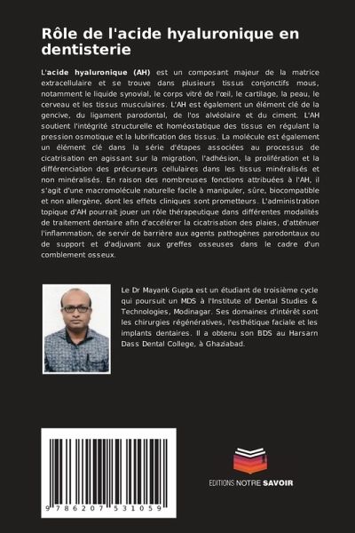 L'acide hyaluronique (AH) est un composant majeur de la matrice extracellulaire et se trouve dans plusieurs tissus conjonctifs mous, notamment le liquide synovial, le corps vitré de l'oeil, le cartilage, la peau, le cerveau et les tissus musculaires. L'AH est également un élément clé de la gencive, du ligament parodontal, de l'os alvéolaire et du ciment. L'AH soutient l'intégrité structurelle et homéostatique des tissus en régulant la pression osmotique et la lubrification des tissus. La molécule est également un élément clé dans la série d'étapes associées au processus de cicatrisation en agissant sur la migration, l'adhésion, la prolifération et la différenciation des précurseurs cellulaires dans les tissus minéralisés et non minéralisés. En raison des nombreuses fonctions attribuées à l'AH, il s'agit d'une macromolécule naturelle facile à manipuler, sûre, biocompatible et non allergène, dont les effets cliniques sont prometteurs. L'administration topique d'AH pourrait jouer un rôle thérapeutique dans différentes modalités de traitement dentaire afin d'accélérer la cicatrisation des plaies, d'atténuer l'inflammation, de servir de barrière aux agents pathogènes parodontaux ou de support et d'adjuvant aux greffes osseuses dans le cadre d'un comblement osseux.