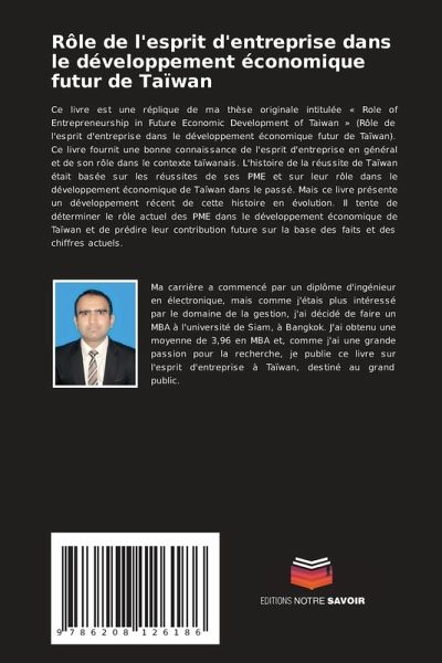 Ce livre est une réplique de ma thèse originale intitulée « Role of Entrepreneurship in Future Economic Development of Taiwan » (Rôle de l'esprit d'entreprise dans le développement économique futur de Taïwan). Ce livre fournit une bonne connaissance de l'esprit d'entreprise en général et de son rôle dans le contexte taïwanais. L'histoire de la réussite de Taïwan était basée sur les réussites de ses PME et sur leur rôle dans le développement économique de Taïwan dans le passé. Mais ce livre présente un développement récent de cette histoire en évolution. Il tente de déterminer le rôle actuel des PME dans le développement économique de Taïwan et de prédire leur contribution future sur la base des faits et des chiffres actuels.