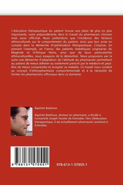 L'éducation thérapeutique du patient trouve une place de plus en plus importante, voire prépondérante dans le travail du pharmacien clinicien mais aussi officinal. Nous prétendons que l'incidence des facteurs ethnoculturels sur le comportement du patient, ainsi que leur prise en compte dans la démarche d'optimisation thérapeutique, s'impose. En prenant l'exemple, en France, des patients diabétiques originaires du Maghreb et d'Afrique Noire, ainsi que de leurs particularités ethnoculturelles, nous essayons de le démontrer. Nous proposons par la suite une démarche d'adaptation de l'attitude du pharmacien permettant au patient de mieux adhérer au traitement prescrit par le médecin et peut-être de mieux comprendre et accepter sa maladie. Ce travail nous conduit au concept d'ethnopharmacie comportementale et à la nécessité de former les pharmaciens officinaux dans ce domaine.