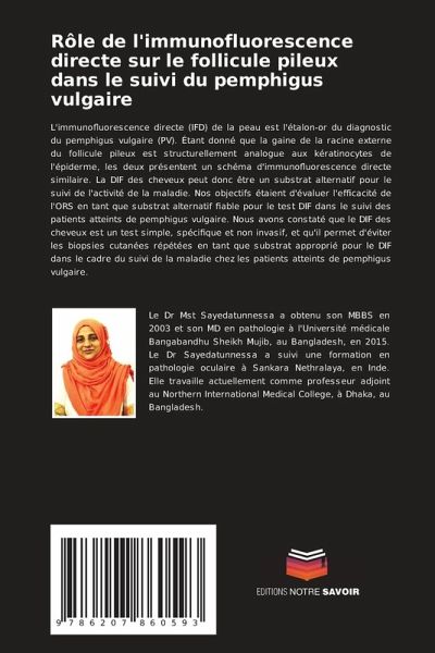 L'immunofluorescence directe (IFD) de la peau est l'étalon-or du diagnostic du pemphigus vulgaire (PV). Étant donné que la gaine de la racine externe du follicule pileux est structurellement analogue aux kératinocytes de l'épiderme, les deux présentent un schéma d'immunofluorescence directe similaire. La DIF des cheveux peut donc être un substrat alternatif pour le suivi de l'activité de la maladie. Nos objectifs étaient d'évaluer l'efficacité de l'ORS en tant que substrat alternatif fiable pour le test DIF dans le suivi des patients atteints de pemphigus vulgaire. Nous avons constaté que le DIF des cheveux est un test simple, spécifique et non invasif, et qu'il permet d'éviter les biopsies cutanées répétées en tant que substrat approprié pour le DIF dans le cadre du suivi de la maladie chez les patients atteints de pemphigus vulgaire.