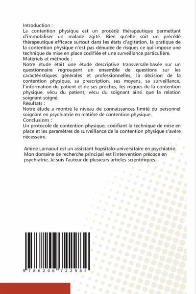 Introduction : La contention physique est un procédé thérapeutique permettant d'immobiliser un malade agité. Bien qu'elle soit un précédé thérapeutique efficace surtout dans les états d'agitation, la pratique de la contention physique n'est pas dénudée de risques ce qui impose une technique de mise en place codifiée et une surveillance particulière. Matériels et méthode :Notre étude était une étude descriptive transversale basée sur un questionnaire regroupant un ensemble de questions sur les caractéristiques générales et professionnelles, la décision de la contention physique, sa prescription, ses moyens, sa surveillance, l'information du patient et de ses proches, les risques de la contention physique, vécu du patient, vécu du soignant ainsi que la relation soignant soigné. Résultats : Notre étude a montré le niveau de connaissances limité du personnel soignant en psychiatrie en matière de contention physique.Conclusions :Un protocole de contention physique, codifiant la technique de mise en place et les paramètres de surveillance de la contention physique s'avère nécessaire.