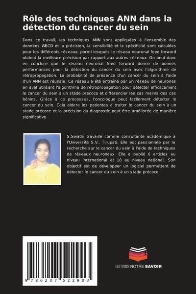 Dans ce travail, les techniques ANN sont appliquées à l'ensemble des données WBCD et la précision, la sensibilité et la spécificité sont calculées pour les différents réseaux, parmi lesquels le réseau neuronal feed forward obtient la meilleure précision par rapport aux autres réseaux. On peut donc en conclure que le réseau neuronal feed forward donne de bonnes performances pour la détection du cancer du sein avec l'algorithme de rétropropagation. La probabilité de présence d'un cancer du sein à l'aide d'un ANN est réussie. Ce réseau a été entraîné par un réseau de neurones en aval utilisant l'algorithme de rétropropagation pour détecter efficacement le cancer du sein à un stade précoce et différencier les cas malins des cas bénins. Grâce à ce processus, l'oncologue peut facilement détecter le cancer du sein. Cela aidera les patientes à traiter le cancer du sein à un stade précoce et la précision du diagnostic peut être améliorée de manière significative.