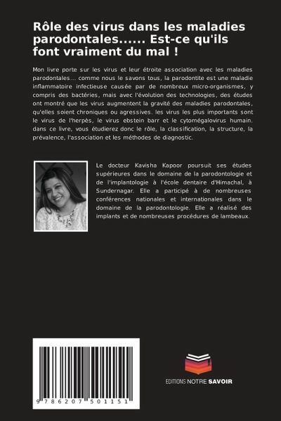 Mon livre porte sur les virus et leur étroite association avec les maladies parodontales... comme nous le savons tous, la parodontite est une maladie inflammatoire infectieuse causée par de nombreux micro-organismes, y compris des bactéries, mais avec l'évolution des technologies, des études ont montré que les virus augmentent la gravité des maladies parodontales, qu'elles soient chroniques ou agressives. les virus les plus importants sont le virus de l'herpès, le virus ebstein barr et le cytomégalovirus humain. dans ce livre, vous étudierez donc le rôle, la classification, la structure, la prévalence, l'association et les méthodes de diagnostic.