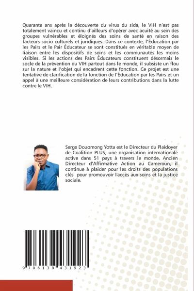 Quarante ans après la découverte du virus du sida, le VIH n'est pas totalement vaincu et continu d'ailleurs d'opérer avec acuité au sein des groupes vulnérables et éloignés des soins de santé en raison des facteurs socio culturels et juridiques. Dans ce contexte, l'Éducation par les Pairs et le Pair Éducateur se sont constitués en véritable moyen de liaison entre les dispositifs de soins et les communautés les moins visibles. Si les actions des Pairs Éducateurs constituent désormais le socle de la prévention du VIH partout dans le monde, il subsiste un flou sur la nature et l'objet qui encadrent cette fonction. Ce projet est une tentative de clarification de la fonction de l'Éducation par les Pairs et un appel à une meilleure considération de leurs contributions dans la lutte contre le VIH.