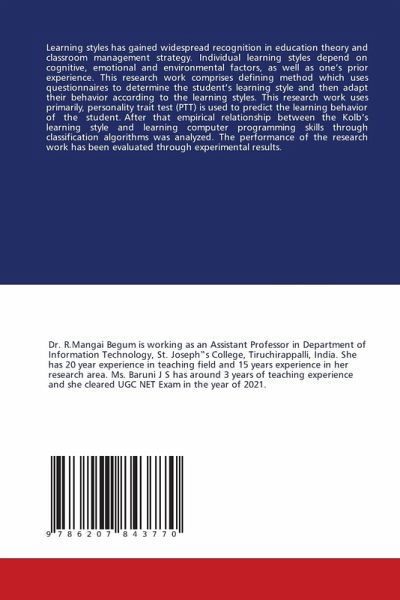 Learning styles has gained widespread recognition in education theory and classroom management strategy. Individual learning styles depend on cognitive, emotional and environmental factors, as well as one's prior experience. This research work comprises defining method which uses questionnaires to determine the student's learning style and then adapt their behavior according to the learning styles. This research work uses primarily, personality trait test (PTT) is used to predict the learning behavior of the student. After that empirical relationship between the Kolb's learning style and learning computer programming skills through classification algorithms was analyzed. The performance of the research work has been evaluated through experimental results.