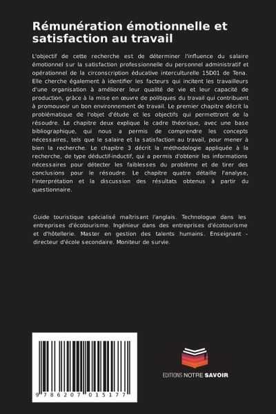 L'objectif de cette recherche est de déterminer l'influence du salaire émotionnel sur la satisfaction professionnelle du personnel administratif et opérationnel de la circonscription éducative interculturelle 15D01 de Tena. Elle cherche également à identifier les facteurs qui incitent les travailleurs d'une organisation à améliorer leur qualité de vie et leur capacité de production, grâce à la mise en oeuvre de politiques du travail qui contribuent à promouvoir un bon environnement de travail. Le premier chapitre décrit la problématique de l'objet d'étude et les objectifs qui permettront de la résoudre. Le chapitre deux explique le cadre théorique, avec une base bibliographique, qui nous a permis de comprendre les concepts nécessaires, tels que le salaire et la satisfaction au travail, pour mener à bien la recherche. Le chapitre 3 décrit la méthodologie appliquée à la recherche, de type déductif-inductif, qui a permis d'obtenir les informations nécessaires pour détecter les faiblesses du problème et de tirer des conclusions pour le résoudre. Le chapitre quatre détaille l'analyse, l'interprétation et la discussion des résultats obtenus à partir du questionnaire.