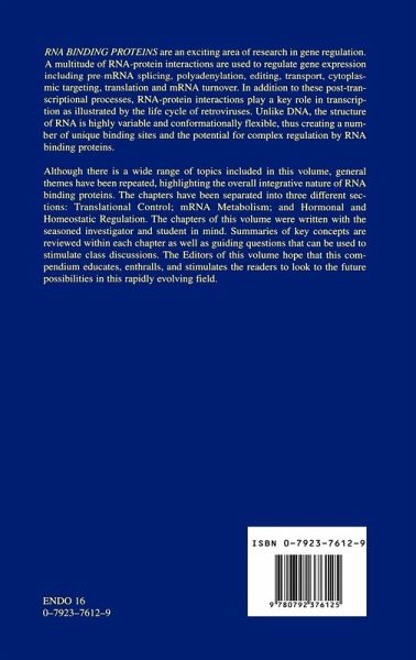 Although there is a wide range of topics included in this volume, general themes have been repeated, highlighting the overall integrative nature of RNA binding proteins. The chapters have been separated into three different sections: Translational Control; mRNA Metabolism; and Hormonal and Homeostatic Regulation. The chapters of this volume were written with the seasoned investigator and student in mind. Summaries of key concepts are reviewed within each chapter as well as guiding questions that can be used to stimulate class discussions. The Editors of this volume hope that this compendium educates, enthralls, and stimulates the readers to look to the future possibilities in this rapidly evolving field.