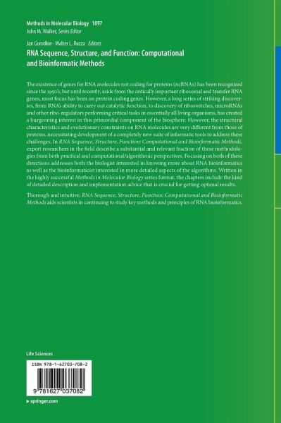 The existence of genes for RNA molecules not coding for proteins (ncRNAs) has been recognized since the 1950's, but until recently, aside from the critically important ribosomal and transfer RNA genes, most focus has been on protein coding genes. However, a long series of striking discoveries, from RNA's ability to carry out catalytic function, to discovery of riboswitches, microRNAs and other ribo-regulators performing critical tasks in essentially all living organisms, has created a burgeoning interest in this primordial component of the biosphere. However, the structural characteristics and evolutionary constraints on RNA molecules are very different from those of proteins, necessitating development of a completely new suite of informatic tools to address these challenges. In RNA Sequence, Structure, Function: Computational and Bioinformatic Methods, expert researchers in the field describe a substantial and relevant fraction of these methodologies from both practical and computational/algorithmic perspectives. Focusing on both of these directions addresses both the biologist interested in knowing more about RNA bioinformatics as well as the bioinformaticist interested in more detailed aspects of the algorithms. Written in the highly successful Methods in Molecular Biology series format, the chapters include the kind of detailed description and implementation advice that is crucial for getting optimal results.