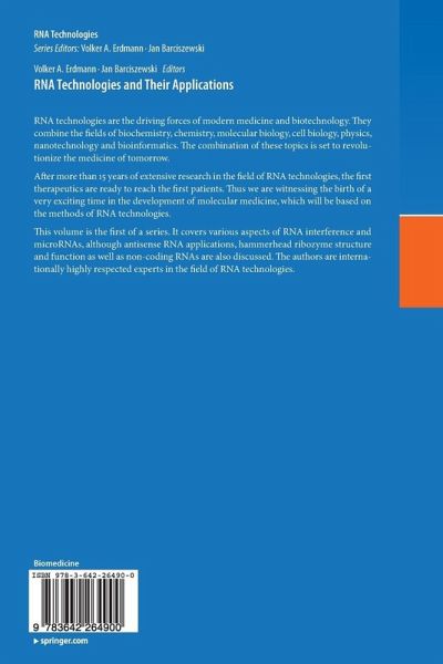 RNA technologies are the driving forces of modern medicine and biotechnology. They combine the fields of biochemistry, chemistry, molecular biology, cell biology, physics, nanotechnology and bioinformatics. The combination of these topics is set to revolutionize the medicine of tomorrow. After more than 15 years of extensive research in the field of RNA technologies, the first therapeutics are ready to reach the first patients. Thus we are witnessing the birth of a very exciting time in the development of molecular medicine, which will be based on the methods of RNA technologies. This volume is the first of a series. It covers various aspects of RNA interference and microRNAs, although antisense RNA applications, hammerhead ribozyme structure and function as well as non-coding RNAs are also discussed. The authors are internationally highly respected experts in the field of RNA technologies