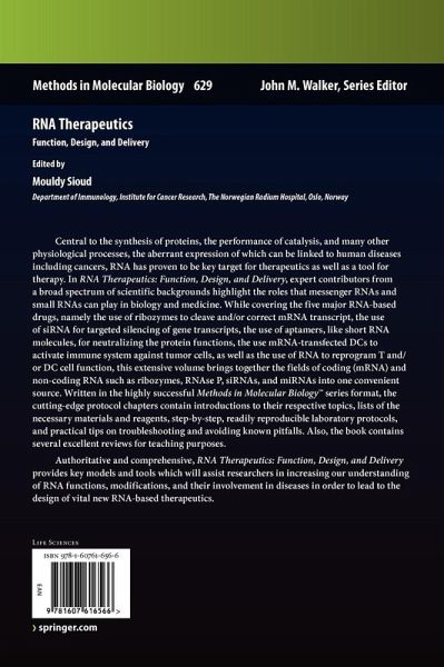 Authoritative and comprehensive, RNA Therapeutics: Function, Design, and Delivery provides key models and tools which will assist researchers in increasing our understanding of RNA functions, modifications, and their involvement in diseases in order to lead to the design of vital new RNA-based therapeutics.