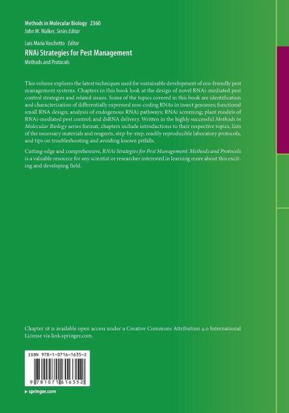 Genome-Wide Identification and Functional Characterization of Non-Coding RNAs (ncRNAs) Differentially Expressed during Insect Development.- Identification and Functional Characterization of Argonaute (Ago) Proteins in Insect Genomes.- Functional Characterization of Silkworm PIWI Proteins by Embryonic RNAi.- Guiding RNAi Design through Characterization of Endogenous Small RNA Pathways.- Silencing of Molecular Targets with Relevance to Insecticide Resistance in Colorado Potato Beetle using dsRNA.- Visualization of RNA Transcripts in Western Corn Rootworm (Diabrotica virgifera virgifera) and Plants by In Situ Hybridization.- In Silico Screening of Attractive Target Genes for RNAi-Based Pest Control.- RNAi Feeding Bioassay: A Protocol for dsRNA Screening against Asian Citrus Psyllid and Related Hemipteran Insects.- A Random-Screening Approach to Identify RNAi Targets for the Control of Western Corn Rootworm (Diabrotica. virgifera virgifera Le Conte).- Rapid Screening of Myzus persicae (Green Peach Aphid) RNAi Targets using Tobacco rattle virus.- Genome-Wide Identification and Validation of Target Genes Associated with Insecticide Treatment of the Green Peach Aphid, Myzus persicae.- Inhibition of Rhopalosiphum maidis (Corn Leaf Aphid) Growth on Maize by Virus-Induced Gene Silencing with Sugarcane mosaic virus.- RT-qPCR for Detection and Expression Monitoring of Core Genes Involved in the RNA Interference Pathways of Western Corn Rootworm (Diabrotica virgifera virgifera).- Examination of the Suitability of Attractive Target Genes for RNAi-Based Pest Control.- Functional Characterization of Target Genes Associated with Insecticide Resistance of the Green Peach Aphid, Myzus persicae.- Plant-Mediated RNA Interference Expressing dsRNA in Cytoplasm for RNAi-Based Pest Control.- RNAi Expression in Cotton for Control of Herbivorous Insects.- Transplastomic Tomato Plants Expressing Insect-Specific Double-Stranded RNAs: A Protocol Based on Biolistic Transformation.- Double-Strand RNA (dsRNA) Delivery Methods in Insects: Diaphorina citri.- Delivery of Double-Stranded RNAs (dsRNAs) Produced by Escherichia coli HT115 (DE3) for Non-Transgenic RNAi-Based Insect Pest-Management.- Symbiont-Mediated RNA Interference (SMR): Using Symbiotic Bacteria as Vectors for Delivering RNAi to Insects.- Application of Nanoparticle-Mediated RNAi for Efficient Gene Silencing and Pest Control on Soybean Aphids.- Methods for Delivery of dsRNAs for Agricultural Pest Control: The Case of Lepidopteran.- The CRISPR/Cas9-Mediated Genome Editing System in Insect Genomics and Pest Management.