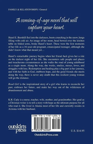 A coming-of-age novel that will capture your heart. Hazel E. Barnhill fled into the darkness, boots crunching in the snow, lungs filling with cold air. An image of her mom, head bowed over the kitchen table on folded arms, broke Hazel's heart. These were the first moments of her life as a 16-year-old pregnant, emancipated teenager, although she didn't know what that meant yet... Hazel's remarkable journey begins when her friend Jack gives her a ride on the darkest night of her life. She encounters safe people and places and treacherous circumstances as she walks the road of young adulthood as a single mom. Along the way, she works, studies, nurses, loves, and struggles with loss. Redemption and healing play a big part in her journey, and with her faith in God, stubborn hope, and the good friends she meets along the way, there is never any doubt that this resilient young woman will go the distance. Road Girl is the inspirational story of a girl who learns to reconcile her past, embrace her future, and make her way out of the wilderness of abandonment and abuse.