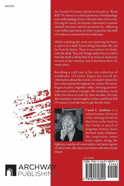 Dr. Gerald O'Connor, known to friends as "Road Kill" O'Connor is a retired professor of archaeology and anthropology from Colorado State University. During his career, he became interested in animal skeletal structure and his penchant for collecting road-killed specimens in order to practice the skill of taxidermy earned him his nickname. While watching the news one morning, he hears a report of a skull found along Interstate 90, not far from his home. There is no evidence of a body, only the skull. The only things authorities can tell is that the skull is likely that of an African American woman in her twenties and it has been there for many years. Recalling a cold case in his vast collection of notebooks, O'Connor begins his search for information about this victim. An expert witness for law enforcement throughout his career, O'Connor begins to piece together other missing persons' cases and a pattern emerges. He concludes a serial killer has been at work for four decades. It's time this murderer was brought to justice and Road Kill O'Connor is just the man to get the job done.