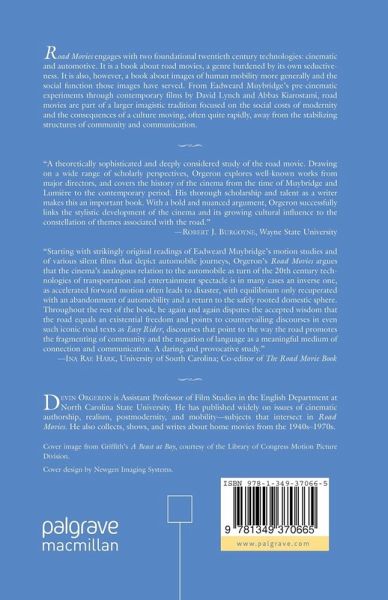 "Starting with strikingly original readings of Eadweard Muybridge s motion studies and of various silent films that depict automobile journeys, Orgeron s Road Movies argues that the cinema s analogous relation to the automobile as turn of the 20th century technologies of transportation and entertainment spectacle is in many cases an inverse one, as accelerated forward motion often leads to disaster, with equilibrium only recuperated with an abandonment of automobility and a return to the safely rooted domestic sphere. Throughout the rest of the book, he again and again disputes the accepted wisdom that the road equals an existential freedom and points to countervailing discourses in even such iconic road texts as Easy Rider, discourses that point to the way the road promotes the fragmenting of community and the negation of language as a meaningful medium of connectionand communication. A daring and provocative study." - Ina Rae Hark, University of South Carolina; Co-editor of The Road Movie Book