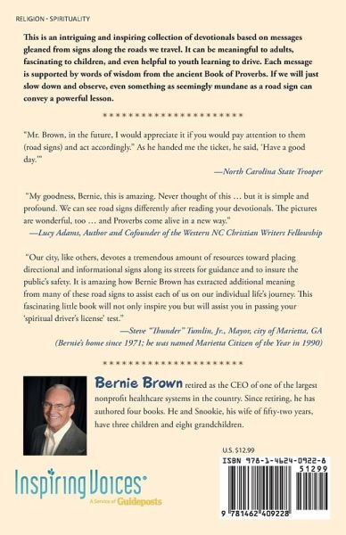This is an intriguing and inspiring collection of devotionals based on messages gleaned from signs along the roads we travel. It can be meaningful to adults, fascinating to children, and even helpful to youth learning to drive. Each message is supported by words of wisdom from the ancient Book of Proverbs. If we will just slow down and observe, even something as seemingly mundane as a road sign can convey a powerful lesson. "Mr. Brown, in the future, I would appreciate it if you would pay attention to them (road signs) and act accordingly." As he handed me the ticket, he said, 'Have a good day.'" -North Carolina State Trooper "My goodness, Bernie, this is amazing. Never thought of this ... but it is simple and profound. We can see road signs differently after reading your devotionals. The pictures are wonderful, too ... and Proverbs come alive in a new way." -Lucy Adams, Author and Cofounder of the Western NC Christian Writers Fellowship "Our city, like others, devotes a tremendous amount of resources toward placing directional and informational signs along its streets for guidance and to insure the public's safety. It is amazing how Bernie Brown has extracted additional meaning from many of these road signs to assist each of us on our individual life's journey. This fascinating little book will not only inspire you but will assist you in passing your 'spiritual driver's license' test." -Steve "Thunder" Tumlin, Jr., Mayor, city of Marietta, GA (Bernie's home since 1971; he was named Marietta Citizen of the Year in 1990)