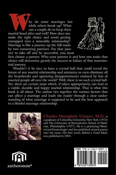 Why do some marriages last while others break up? What can a couple do to keep their marital bond alive and well? How does one make the right choice and avoid getting entrapped into a miserable relationship? Marriage is like a journey up the hill made by two consenting partners. For that journey to take off and be successful, you must first choose a partner. Who your partner is and how you make that choice will determine greatly the success or failure of that matrimonial journey. Wouldn't it be nice to have a crystal ball that could reveal the future of any marital relationship and minimize or even eliminate all the heartbreaks and agonizing disappointments endured by lots of married people all over the world? Well, there is no such crystal ball. Yet, there are certain steps which, if taken appropriately, can lead to a viable, durable and happy marital relationship. That is what this book is all about. The author ties together the various factors that can affect a marriage and leads the reader through a clear understanding of what marriage is supposed to be and the best approach to a blissful marriage relationship.