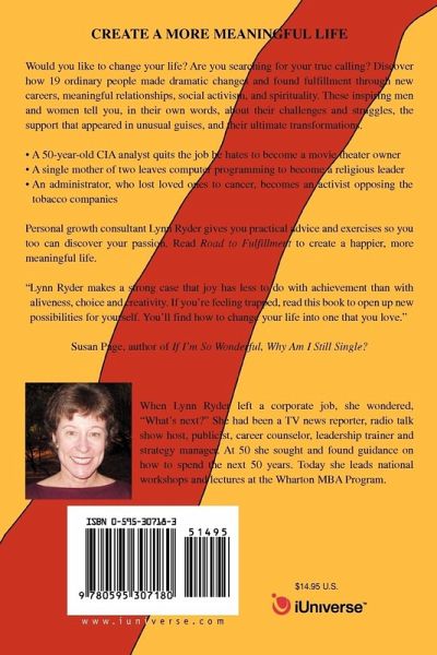 CREATE A MORE MEANINGFUL LIFE Would you like to change your life? Are you searching for your true calling? Discover how 20 ordinary people made dramatic changes and found fulfillment through new careers, meaningful relationships, social activism, and spirituality. These inspiring men and women tell you, in their own words, about their challenges and struggles, the support that appeared in unusual guises, and their ultimate transformations. A 50-year-old CIA analyst quits the job he hates to become a movie theater owner A single mother of two leaves computer programming to become a religious leader An administrator, who lost loved ones to cancer, becomes an activist opposing the tobacco companies Personal growth consultant Lynn Ryder gives you practical advice and exercises so you too can discover your passion. Read Road to Fulfillment to create a happier, more meaningful life. "Lynn Ryder makes a strong case that joy has less to do with achievement than with aliveness, choice and creativity. If you're feeling trapped, read this book to open up new possibilities for yourself. You'll find how to change your life into one that you love." Susan Page, author of If I'm So Wonderful, Why Am I Still Single?