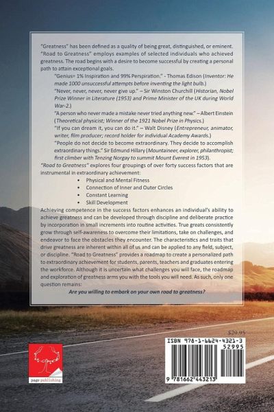 "Greatness" has been defined as a quality of being great, distinguished, or eminent. "Road to Greatness" employs examples of selected individuals who achieved greatness. The road begins with a desire to become successful by creating a personal path to attain exceptional goals. "Genius= 1% Inspiration and 99% Perspiration." - Thomas Edison (Inventor: He made 1000 unsuccessful attempts before inventing the light bulb.) "Never, never, never, never give up." - Sir Winston Churchill (Historian, Nobel Prize Winner in Literature (1953) and Prime Minister of the UK during World War-2.) "A person who never made a mistake never tried anything new." - Albert Einstein (Theoretical physicist; Winner of the 1921 Nobel Prize in Physics.) "If you can dream it, you can do it." - Walt Disney (Entrepreneur, animator, writer, film producer; record holder for individual Academy Awards.) "People do not decide to become extraordinary. They decide to accomplish extraordinary things." Sir Edmund Hillary (Mountaineer, explorer, philanthropist; first climber with Tenzing Norgay to summit Mount Everest in 1953). "Road to Greatness" explores four groupings of over forty success factors that are instrumental in extraordinary achievement: Physical and Mental Fitness Connection of Inner and Outer Circles Constant Learning Skill Development Achieving competence in the success factors enhances an individual's ability to achieve greatness and can be developed through discipline and deliberate practice by incorporation in small increments into routine activities. True greats consistently grow through self-awareness to overcome their limitations, take on challenges, and endeavor to face the obstacles they encounter. The characteristics and traits that drive greatness are inherent within all of us and can be applied to any field, subject, or discipline. "Road to Greatness" provides a roadmap to create a personalized path to extraordinary achievement for students, parents, teachers and graduates entering the workforce. Although it is uncertain what challenges you will face, the roadmap and exploration of greatness arms you with the tools you will need. As such, only one question remains: Are you willing to embark on your own road to greatness?