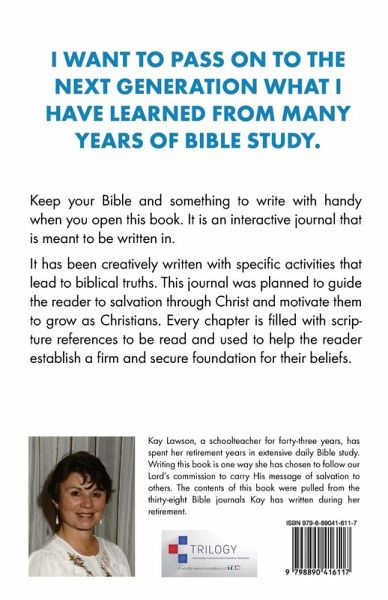 I WANT TO PASS ON TO THE NEXT GENERATION WHAT I HAVE LEARNED FROM MANY YEARS OF BIBLE STUDY. Keep your Bible and something to write with handy when you open this book. It is an interactive journal that is meant to be written in. It has been creatively written with specific activities that lead to biblical truths. This journal was planned to guide the reader to salvation through Christ and motivate them to grow as Christians. Every chapter is filled with scripture references to be read and used to help the reader establish a firm and secure foundation for their beliefs.