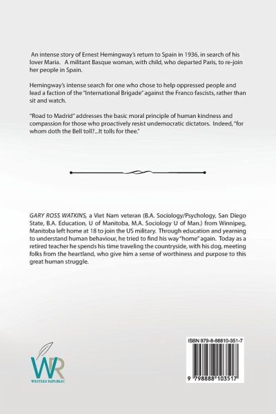 An intense story of Ernest Hemingway's return to Spain in 1936, in search of his lover Maria. A militant Basque woman, with child, who departed Paris, to re-join her people in Spain. Hemingway's intense search for one who chose to help oppressed people and lead a faction of the "International Brigade" against the Franco fascists, rather than sit and watch. "Road to Madrid" addresses the basic moral principle of human kindness and compassion for those who proactively resist undemocratic dictators. Indeed, "for whom doth the Bell toll?...It tolls for thee."