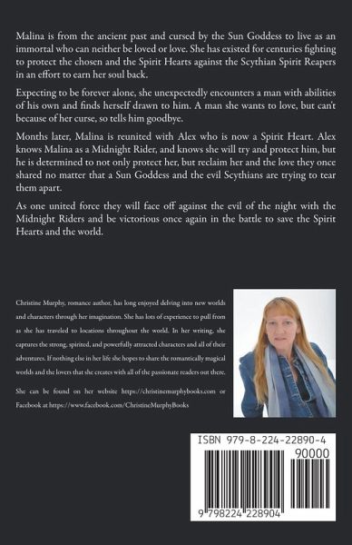 Malina is from the ancient past and cursed by the Sun Goddess to live as an immortal who can neither be loved or love. She has existed for centuries fighting to protect the chosen and the Spirit Hearts against the Scythian Spirit Reapers in an effort to earn her soul back. Expecting to be forever alone, she unexpectedly encounters a man with abilities of his own and finds herself drawn to him. A man she wants to love, but can't because of her curse, so tells him goodbye. Months later, Malina is reunited with Alex who is now a Spirit Heart. Alex knows Malina as a Midnight Rider, and knows she will try and protect him, but he is determined to not only protect her, but reclaim her and the love they once shared no matter that a Sun Goddess and the evil Scythians are trying to tear them apart. As one united force they will face off against the evil of the night with the Midnight Riders and be victorious once again in the battle to save the Spirit Hearts and the world.