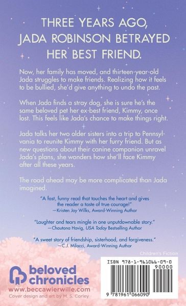 A hopeful adventure for kids ages 8-12 about sisterhood, friendship, and the power of starting over. Three years ago, Jada Robinson betrayed her best friend. Now, her family has moved, and thirteen-year-old Jada struggles to make friends. Realizing how it feels to be bullied, she'd give anything to undo the past. When Jada finds a stray dog, she is sure he's the same beloved pet her ex-best friend, Kimmy, once lost. This feels like Jada's chance to make things right. Jada talks her two older sisters into a trip to Pennsylvania to reunite Kimmy with her furry friend. But as new questions about their canine companion unravel Jada's plans, she wonders how she'll face Kimmy after all these years. The road ahead may be more complicated than Jada imagined. "A fast, funny read that touches the heart and gives the reader a taste of true courage!" -Kristen Joy Wilks, Award-Winning Author of Phooey Kerflooey "Laughter and tears mingle in one unputdownable story." -Chautona Havig, USA Today Bestselling Author and Host of the Because Fiction Podcast "A sweet story of friendship, sisterhood, and forgiveness." -C.J. Milacci, Award-Winning Author of the Talionis Series and Host of the Read Clean YA with CJ Podcast