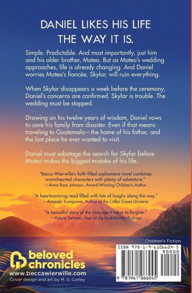 A faith-filled international adventure for kids ages 8-12 about facing the past to embrace the future. Daniel likes his life the way it is. Simple. Predictable. And most importantly, just him and his older brother, Mateo. But as Mateo's wedding approaches, life is already changing. And Daniel worries Mateo's fiancée, Skylar, will ruin everything. When Skylar disappears a week before the ceremony, Daniel's concerns are confirmed. Skylar is trouble. The wedding must be stopped. Drawing on his twelve years of wisdom, Daniel vows to save his family from disaster. Even if that means traveling to Guatemala-the home of his father, and the last place he ever wanted to visit. Daniel must sabotage the search for Skylar before Mateo makes the biggest mistake of his life. "A heartwarming read with lots of laughs along the way." -Amanda Trumpower, Author of the Collar Cases Universe "Feels new and surprising while delivering the same wit and heart that made the first book so special." -Jon Tilton, Author of The Lands of Luxury Series "A beautiful story of the courage it takes to forgive." -Valerie Fentress, Award-Winning Children's Author and Host of the BookWorthy Podcast