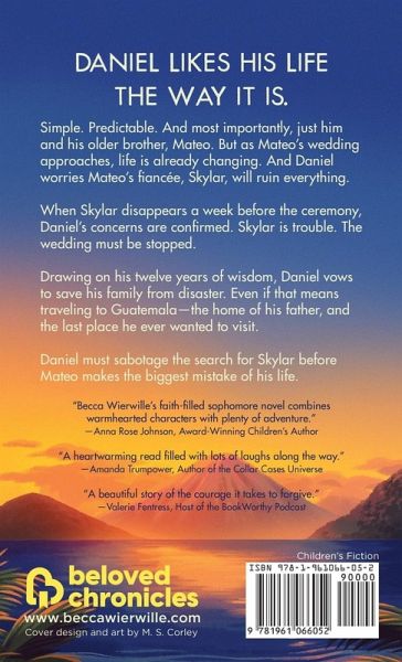 A faith-filled international adventure for kids ages 8-12 about facing the past to embrace the future. Daniel likes his life the way it is. Simple. Predictable. And most importantly, just him and his older brother, Mateo. But as Mateo's wedding approaches, life is already changing. And Daniel worries Mateo's fiancée, Skylar, will ruin everything. When Skylar disappears a week before the ceremony, Daniel's concerns are confirmed. Skylar is trouble. The wedding must be stopped. Drawing on his twelve years of wisdom, Daniel vows to save his family from disaster. Even if that means traveling to Guatemala-the home of his father, and the last place he ever wanted to visit. Daniel must sabotage the search for Skylar before Mateo makes the biggest mistake of his life. "A heartwarming read with lots of laughs along the way." -Amanda Trumpower, Author of the Collar Cases Universe "Feels new and surprising while delivering the same wit and heart that made the first book so special." -Jon Tilton, Author of The Lands of Luxury Series "A beautiful story of the courage it takes to forgive." -Valerie Fentress, Award-Winning Children's Author and Host of the BookWorthy Podcast