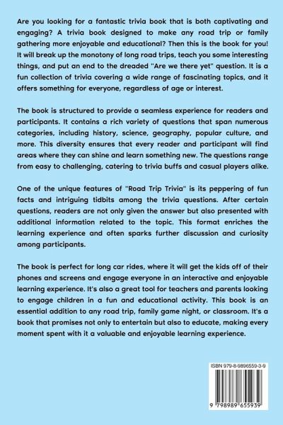 Are you looking for a fantastic trivia book that is both captivating and engaging? A trivia book designed to make any road trip or family gathering more enjoyable and educational? Then this is the book for you! It will break up the monotony of long road trips, teach you some interesting things, and put an end to the dreaded "Are we there yet" question. It is a fun collection of trivia covering a wide range of fascinating topics, and it offers something for everyone, regardless of age or interest. The book is structured to provide a seamless experience for readers and participants. It contains a rich variety of questions that span numerous categories, including history, science, geography, popular culture, and more. This diversity ensures that every reader and participant will find areas where they can shine and learn something new. The questions range from easy to challenging, catering to trivia buffs and casual players alike. One of the unique features of "Road Trip Trivia" is its peppering of fun facts and intriguing tidbits among the trivia questions. After certain questions, readers are not only given the answer but also presented with additional information related to the topic. This format enriches the learning experience and often sparks further discussion and curiosity among participants. The book is perfect for long car rides, where it will get the kids off of their phones and screens and engage everyone in an interactive and enjoyable learning experience. It's also a great tool for teachers and parents looking to engage children in a fun and educational activity. This book is an essential addition to any road trip, family game night, or classroom. It's a book that promises not only to entertain but also to educate, making every moment spent with it a valuable and enjoyable learning experience.