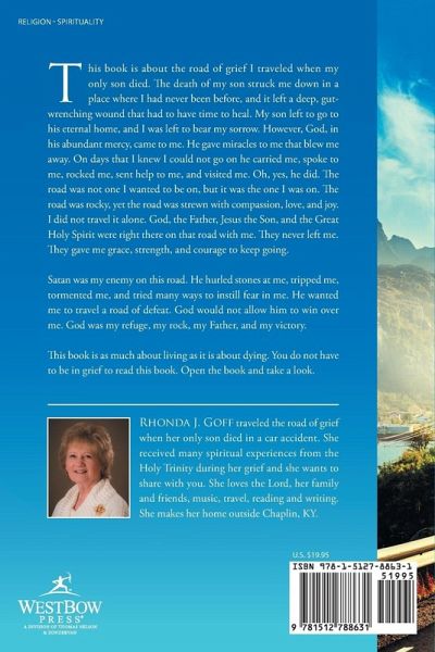 This book is about the road of grief I traveled when my only son died. The death of my son struck me down in a place where I had never been before, and it left a deep, gut-wrenching wound that had to have time to heal. My son left to go to his eternal home, and I was left to bear my sorrow. However, God, in his abundant mercy, came to me. He gave miracles to me that blew me away. On days that I knew I could not go on he carried me, spoke to me, rocked me, sent help to me, and visited me. Oh, yes, he did. The road was not one I wanted to be on, but it was the one I was on. The road was rocky, yet the road was strewn with compassion, love, and joy. I did not travel it alone. God, the Father, Jesus the Son, and the Great Holy Spirit were right there on that road with me. They never left me. They gave me grace, strength, and courage to keep going. Satan was my enemy on this road. He hurled stones at me, tripped me, tormented me, and tried many ways to instill fear in me. He wanted me to travel a road of defeat. God would not allow him to win over me. God was my refuge, my rock, my Father, and my victory. This book is as much about living as it is about dying. You do not have to be in grief to read this book. Open the book and take a look.