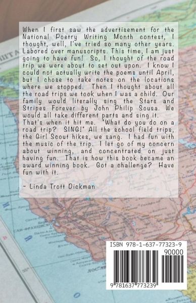 When I first saw the advertisement for the National Poetry Writing Month contest, I thought, well, I've tried so many other years. Labored over manuscripts. This time, I am just going to have fun! So, I thought of the road trip we were about to set out upon. I know I could not actually write the poems until April, but I chose to take notes on the locations where we stopped. Then I thought about all the road trips we took when I was a child. Our family would literally sing the Stars and Stripes Forever by John Philip Sousa. We would all take different parts and sing it. That's when it hit me. "What do you do on a road trip? SING!" All the school field trips, the Girl Scout hikes, we sang. I had fun with the music of the trip. I let go of my concern about winning, and concentrated on just having fun. That is how this book became an award winning book. Got a challenge? Have fun with it. ~ Linda Trott Dickman