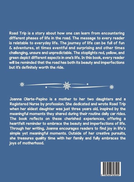 Road Trip is a story about how one can learn from encountering different phases of life in the road. The message to every reader is relatable to everyday life and how life can sometimes be fun, exciting, and smooth and other times rough, unsure, and unpredictable. The stoplights red, yellow, and green depict different aspects in one's life. In this book, it will remind every reader that the road has both its beauty and imperfections, but it's definitely worth the ride.
