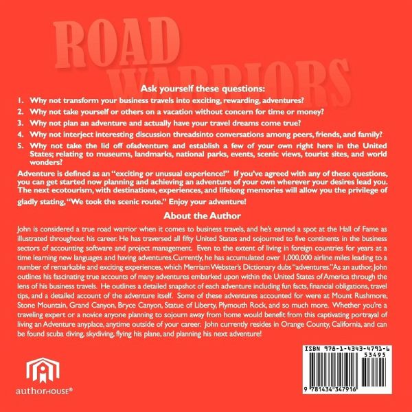 Adventure is defined by Merriam Webster's Dictionary as "an exciting or remarkable experience!" Coupled with the high desire to achieve, and John's high octane of energy; this adventure book will guide you through embarking on your very own exciting or remarkable experience within your career, vacation, or family adventures. A book which illustrates the many memorable activities you and your peers could embark upon, all within the United States of America and principles that apply in traveling across the world. John is a highly experienced traveler for corporate America (a true road warrior), having sojourned to all fifty states and a score of countries all by the age of thirty-five. John lives an adventure outside of his career commitments while on business travel for high-end clients in the accounting and private franchising fields. It is his intent, to place us in the pilot's seat of an adventurous career path of our own. This book will inspire us to make that leap of faith and add some fun adventures into our hectic career and family schedules. This is also a great read for busy moms or dads in which addresses some important issues like finances and time commitments. His recipe for living-out an adventure is broken down into synced chapters outlining one career adventure after another. To highlight a few are among places like Mount Rushmore, Statue of Liberty, Mendenhall Glacier, the Golden Gate Bridge, Grand Canyon, the Smithsonian Institute, Hawaii, Bryce Canyon, Plymouth Rock, Hearst Castle, Stone Mountain, Scuba Diving, and Sky Diving! This book sets the stage for anyone, any family, or any corporate team, to obtain an exciting and remarkable experience, wherever that may lead!