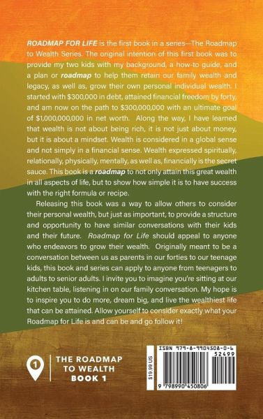 Roadmap for Life is the first in a series of books entitled, The Roadmap to Wealth Series. This first book is an overview of the full series. The original intention of this book and the series was to provide my two children with my and my wife's background, a "how-to guide", and a plan or "Roadmap" to help them retain our legacy and family wealth, as well as grow their personal/individual wealth. You will read in this book that wealth is not about being rich. It is not just about money, but about a mindset. Wealth is considered in a global sense and not simply in a financial sense. We wanted our children to know how to be wealthy spiritually, relationally, physically, and mentally, as well as financially. Ideas about wealth are given in a broad sense and also in specific examples of how to achieve these different aspects of wealth. Roadmap for Life lays out the thoughts and the basis, while the follow-up books will provide the specifics with examples. Releasing this book was a way to allow others to consider their personal wealth, but just as important, it provides a structure and oppurtunity to have similar conversations with their kids about their future. Roadmap for Life will appeal to anyone who endeavors to grow their wealth. Originally meant to be a conversation between us as parents in our forties to our teenage kids, this book and series will apply to anyone from teenagers to adults to senior adults. While reading or listening, allow yourself to consider exactly what your Roadmap for Life is and can be!