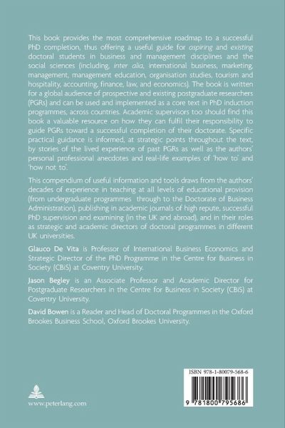 This compendium of useful information and tools draws from the authors' decades of experience in teaching at all levels of educational provision (from undergraduate programmes through to the Doctorate of Business Administration), publishing in academic journals of high repute, successful PhD supervision and examining (in the UK and abroad), and in their roles as strategic and academic directors of doctoral programmes in different UK universities.