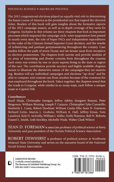 The 2012 congressional elections played an equally vital role in determining the future course of America as the presidential race that topped the electoral ticket. Readers of this book will gain insights about the formative aspects of the 2012 campaign season as well as in depth coverage of key races for Congress. Exclusive to this volume are three chapters that look at important processes which impacted the campaign cycle: voter suppression laws passed in nearly every state, the role of Super PACs and independent expenditures in the wake of the Citizens United Supreme Court decision, and the results of redistricting and partisan gerrymandering throughout the country. Then the case studies follow the path of seven House and six Senate races from inception to election postmortem. The chapters are both narrative and provide analysis of an array of interesting and diverse contests from throughout the country. Each entry was written by one or more experts living in the state or region of the race. The authors provide succinct and highly readable chapters meant to illustrate the distinctive nature of the campaigns they are examining. Readers will see individual campaigns and elections "up close" and be able to compare and contrast one from another because of the common format employed throughout the book. Taken together, the chapters reveal that the roads to Congress, while similar in so many ways, each follow a unique route to Capitol Hill.