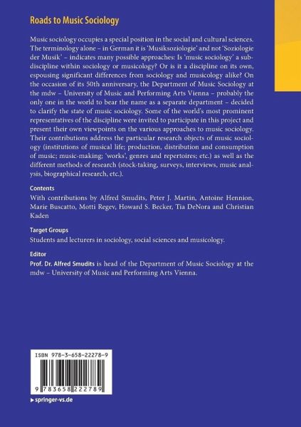 Music sociology occupies a special position in the social and cultural sciences. The terminology alone - in German it is 'Musiksoziologie' and not 'Soziologie der Musik' - indicates many possible approaches: Is 'music sociology' a subdiscipline within sociology or musicology? Or is it a discipline on its own, espousing significant differences from sociology and musicology alike? On the occasion of its 50th anniversary, the Department of Music Sociology at the mdw - University of Music and Performing Arts Vienna - probably the only one in the world to bear the name as a separate department - decided to clarify the state of music sociology. Some of the world's most prominent representatives of the discipline were invited to participate in this project and present their own viewpoints on the various approaches to music sociology. Their contributions address the particular research objects of music sociology (institutions of musical life; production, distribution and consumption of music;music-making; 'works', genres and repertoires; etc.) as well as the different methods of research (stock-taking, surveys, interviews, music analysis, biographical research, etc.).