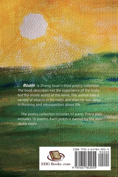 Roam is Zhang Guan's third poetry collection after A Secret in a Distant Place and Train, Time and Imagination. The book describes not the experience of the body, but the inside world of the mind. The author saw a variety of objects in his room and then he was deep in thinking and introspection about life. The book includes 11 parts. Every part includes 10 poems. Each poem is named by the item in his room. Zhang Guan's Literary Works: ¿Novels: Who Has Time Failed (2007) Simplified Chinese Edition Love Letter (2015) Traditional Chinese Edition Another Kind of Waste (2015) Traditional Chinese Edition Lemon (2016) Traditional Chinese Edition Lemon (2017) Simplified Chinese Edition Bicycle (2017) Traditional Chinese Edition Nowhere to Go (2018) Traditional Chinese Edition Lemon II (2020) Traditional Chinese Edition ¿Short Stories and Novellas Collection: Daydream in Utopia: a Collection of Guan Zhang's Short Stories and Novellas (2016) Traditional Chinese Edition ¿Poetry Collections: A Secret in a Distant Place (2015) Traditional Chinese Edition A Secret in a Distant Place (2020) English Edition Train, Time and Imagination (2020) Traditional Chinese Edition Roam (2020) Traditional Chinese Edition A Secret in a Distant Place (2021) Simplified Chinese Edition Roam (2023) English Edition
