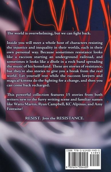 RESIST. Join the RESISTANCE. Meet a whole host of characters -- a drunk, grumpy frog; a nerdy pizza delivery cat, haunted by a ghost; an alligator and a cat in love; a lion and a human in love; soulmates tied together across the boundaries of reincarnation and transformation; a dhole in a rock band; a pangolin with social anxiety; a raccoon stranded planet-side when his spaceship has to leave in a hurry; and many more! These are stories of resistance, but they're also stories to give you a break from the real world, let you rest while the racoon lawyers and magical kittens do the fighting, and then you can come back recharged. Read fifteen stories from both writers new to the furry writing scene and familiar names like Watts Martin, Ryan Campbell, KC Alpinus, and Amy Fontaine in this powerful collection!
