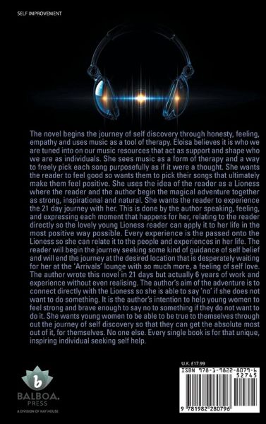 The novel begins the journey of self discovery through honesty, feeling, empathy and uses music as a tool of therapy. Eloisa believes it is who we are tuned into on our music resources that act as support and shape who we are as individuals. She sees music as a form of therapy and a way to freely pick each song purposefully as if it were a thought. She wants the reader to feel good so wants them to pick their songs that ultimately make them feel positive. She uses the idea of the reader as a Lioness where the reader and the author begin the magical adventure together as strong, inspirational and natural. She wants the reader to experience the 21 day journey with her. This is done by the author speaking, feeling, and expressing each moment that happens for her, relating to the reader directly so the lovely young Lioness reader can apply it to her life in the most positive way possible. Every experience is the passed onto the Lioness so she can relate it to the people and experiences in her life. The reader will begin the journey seeking some kind of guidance of self belief and will end the journey at the desired location that is desperately waiting for her at the 'Arrivals' lounge with so much more, a feeling of self love. The author wrote this novel in 21 days but actually 6 years of work and experience without even realising. The author's aim of the adventure is to connect directly with the Lioness so she is able to say 'no' if she does not want to do something. It is the author's intention to help young women to feel strong and brave enough to say no to something if they do not want to do it. She wants young women to be able to be true to themselves through out the journey of self discovery so that they can get the absolute most out of it, for themselves. No one else. Every single book is for that unique, inspiring individual seeking self help.