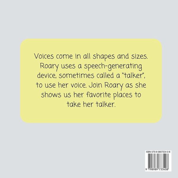 Every person you meet has something to say, but not every person uses their mouth to say it. Some people use their hands to sign, gesture, or point. Some people write or text. Some people use pictures or communication boards. Some people use speech-generating devices, sometimes called "talkers". Roary the Dinosaur uses a talker to tell others what she wants, needs, thinks, and feels. Roary's Talker celebrates allowing everyone a voice in all the spaces that we exist.