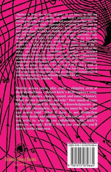 Moving across poem, play, essay - chipping away at their distinctions - Robert Kiely's ROB explores song, grading, vaccines, change, sound, and natural history. What do you remember, and why? How much of your life is determined by biology? Acknowledgments are terminally incomplete, they always must be. So, what can words hold? What if there is not distinction between inside and outside? Who do you love, who do you write to, who do you collaborate with? Kiely's answers are only ROB's. When you read this you'll have to write your own.
