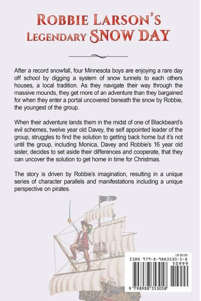 After a record snowfall, four Minnesota boys are enjoying a rare day off school by digging a system of snow tunnels to each others houses, a local tradition. As they navigate their way through the massive mounds, they get more of an adventure than they bargained for when they enter a portal uncovered beneath the snow by Robbie, the youngest of the group. When their adventure lands them in the midst of one of Blackbeard's evil schemes, twelve-year-old Davey, the self-appointed leader of the group, struggles to find the solution to getting back home but it's not until the group, including Monica, Davey and Robbie's 16 year old sister, decides to set aside their differences and cooperate, that they can uncover the solution to get home in time for Christmas. The story is driven by Robbie's imagination, resulting in a unique series of character parallels and manifestations including a peculiar depiction of pirates.
