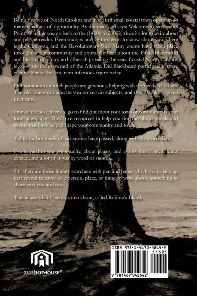 Being a native of North Carolina and living in a small coastal town opens up so many windows of opportunity. As the road sign says: Welcome to Savannah's Point. Whether you go back to the (1400's to 2000's) there's a lot to write about and tell the reader. Even tourists and visitors want to know about you. There is the Civil war, and the Revolutionary War. Many events have taken place throughout our community and yours. We hear about the Pirate Blackbeard and his acts of piracy and other ships sailing the seas. Coastal North Carolina is known as the graveyard of the Atlantic. Did Blackbeard participate in these events? Maybe, he sure is an infamous figure today. Our community church people are generous, helping with the needs of others. The old timers can educate you on certain subjects, and they should be given their time. One of the best places to go to find out about your town or community is your local newspaper. They have resources to help you find out about people and events that have helped shape your community and town. Sad to say but many of our stories have passed, along with the storytellers. I've learned in our community, about places, and events that I never knew existed, and a lot of it was by word of mouth. Still there are those literary searchers with pen and paper who hope to pick up that special treasure of a person, place, or thing to write about, something to share with you and me. This is just what I have written about, called Robbin's Island.