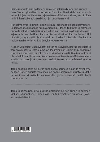 Lähde matkalle ajan sydämeen ja mielen salaisiin huoneisiin, runoelman "Roben yksinäiset vuorovedet" sivuilla. Tämä kiehtova teos kuljettaa lukijan syvälle omien ajatustensa viidakkoon sinne, missä piilee inhimillisen kokemuksen rikkaus ja runouden mahti. Runoelma avaa ikkunan Roben sieluun -- omenapojan, joka kasvoi tarkkailemaan maailmaansa puun oksien läpi. Hänen tulkintansa elämästä punoutuvat yhteen hiljaisuuden ja kohinan, yksinäisyyden ja yhteyden, arjen ja ihmeen hetkien kanssa. Runon säkeiden kautta Robe tutkii lämpöä ja kylmyyttä ihmiskontaktien keskellä. Samalla hän kantaa mukanaan historian kaikua ja nykyhetken sykettä. "Roben yksinäiset vuorovedet" on tarina kasvusta, itsetutkiskelusta ja sen oivalluksesta, että elämä on laajimmillaan silloin kun annamme tunteiden, muistojen ja kokemusten virrata vapaasti. Tämä runoelma ei ole vain lukunautinto, vaan kutsu kokea osa itsestämme Roben matkan kautta. Matkan, jonka jokainen meistä tekee oman mielensä maisemissa. Tämä epookki, joka heijastaa runollisella kauneudellaan ja syvällisyydellään Roben sisäistä maailmaa, on oodi elämän monimuotoisuudelle ja sydämen yksinäisille vuorovesille, jotka ohjaavat meitä kohti tuntematonta. --------------------------------------------------------------------------------------- Tämä kaksiosainen kirja sisältää englanninkielisen runon ja suomenkielisen käännöksen. Toinen osa sisältää syvällisen tulkinnan jokaisesta säkeistöstä.